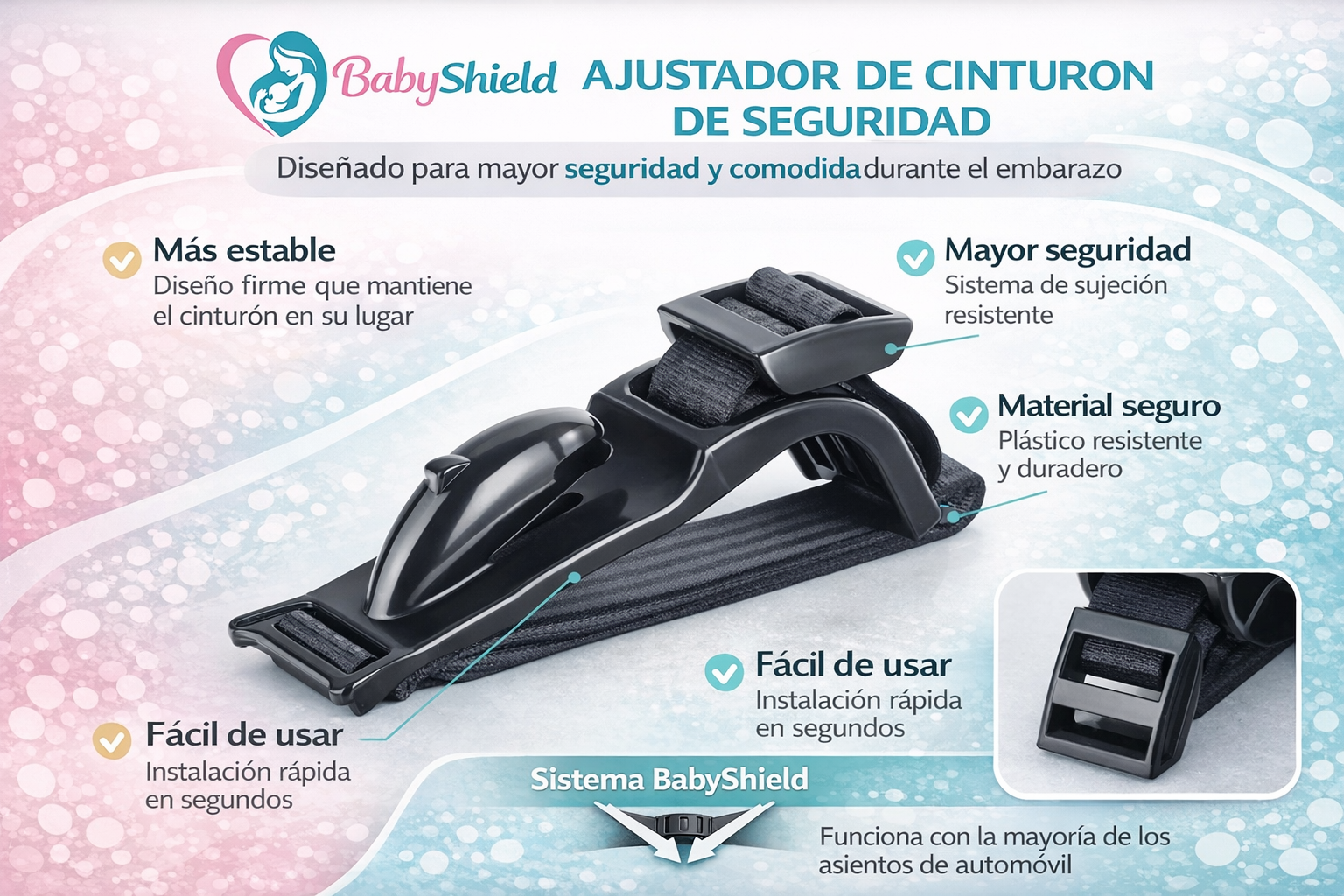 BabyShield fue diseñado para ayudar a redirigir la banda inferior del cinturón hacia una posición más cómoda, evitando que quede sobre el abdomen y permitiendo viajar con mayor tranquilidad.